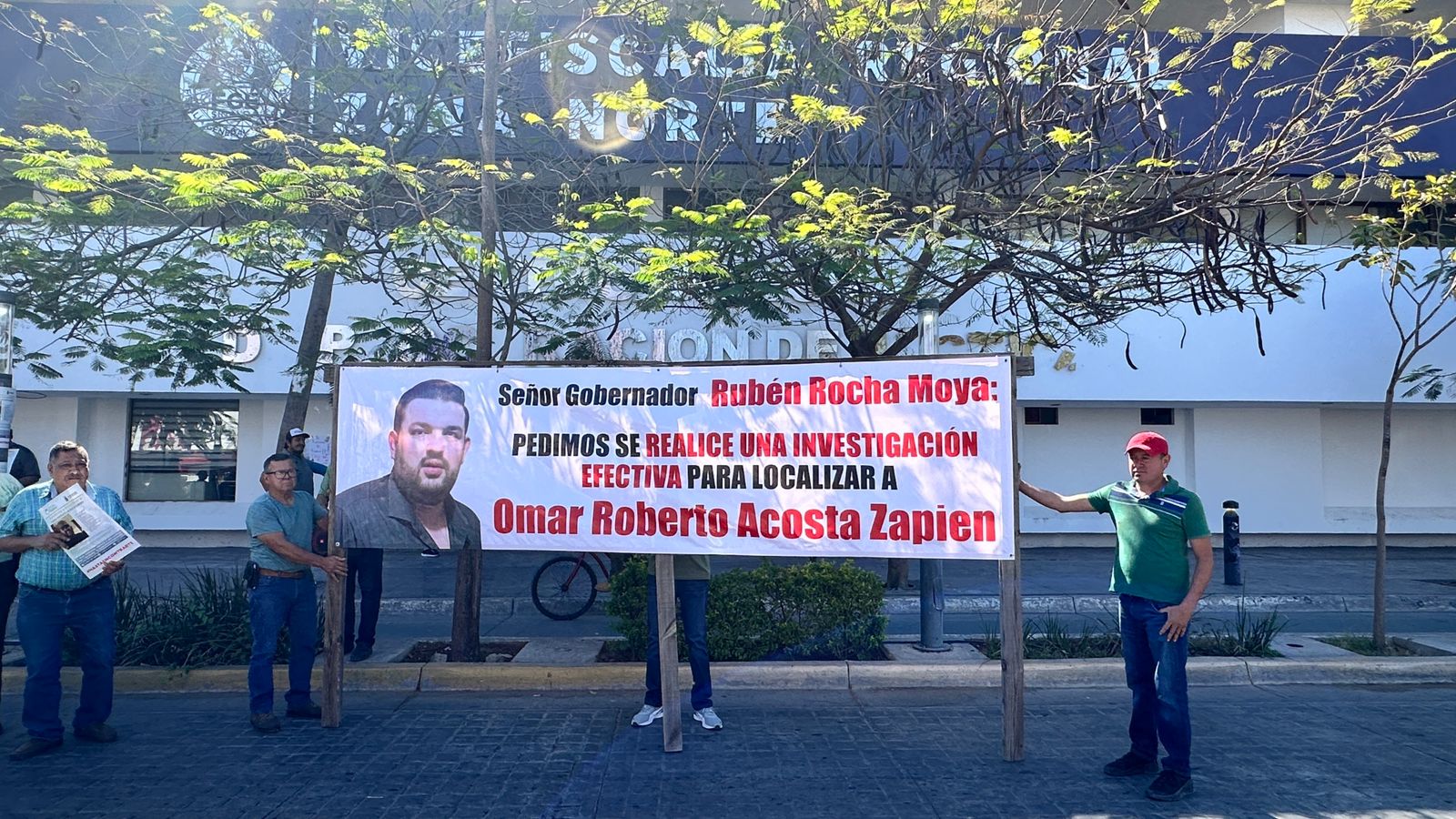 Los manifestantes colocaron una manta con un llamado al gobernador del estado, Rubén Rocha Moya, para que intervenga y se refuercen las acciones de búsqueda.