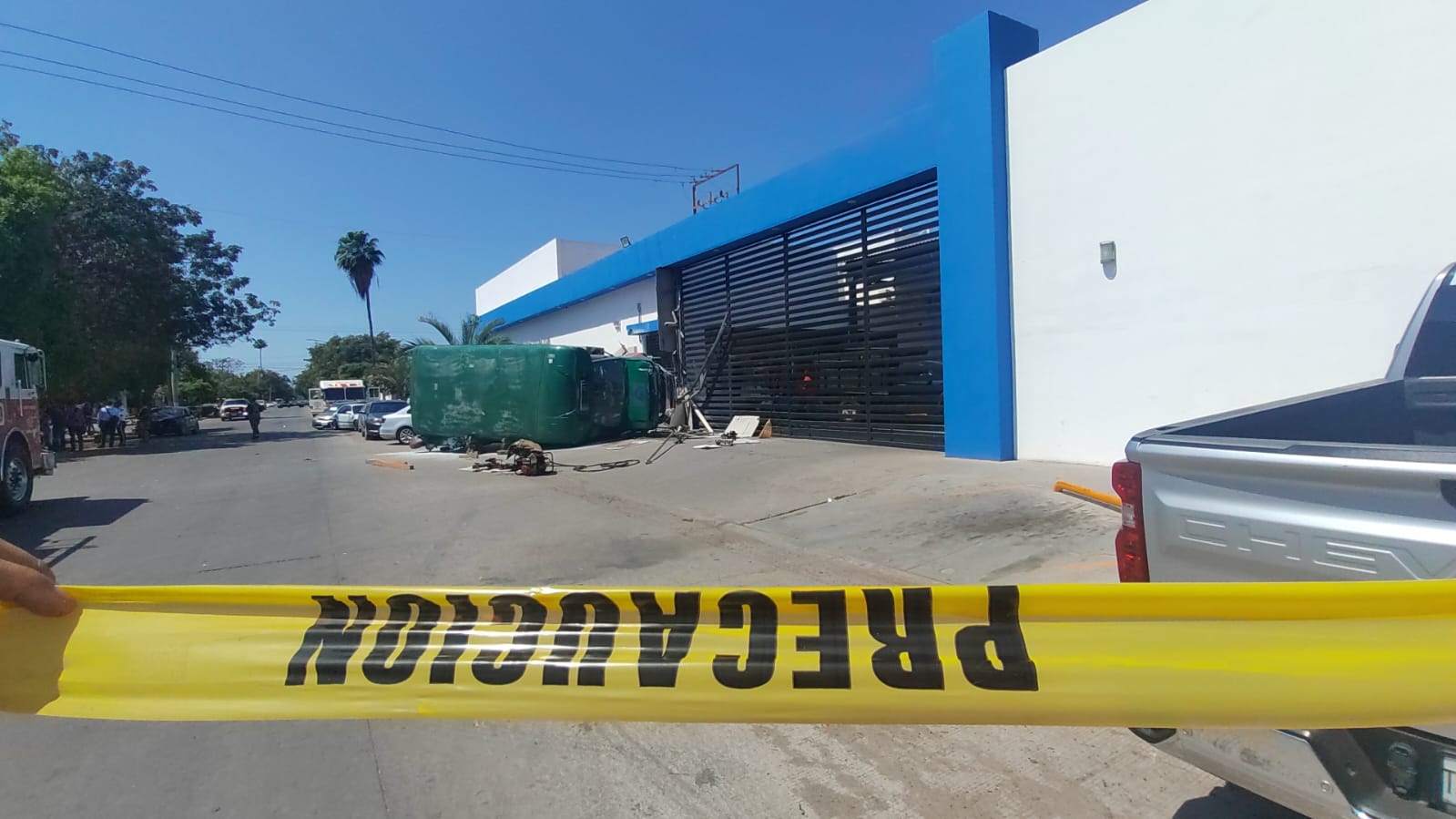 El camión continuó su trayectoria fuera de control, invadiendo la banqueta, impactándose contra la estructura de un establecimiento comercial y avanzando sobre una rampa, lo que finalmente derivó en su volcadura.