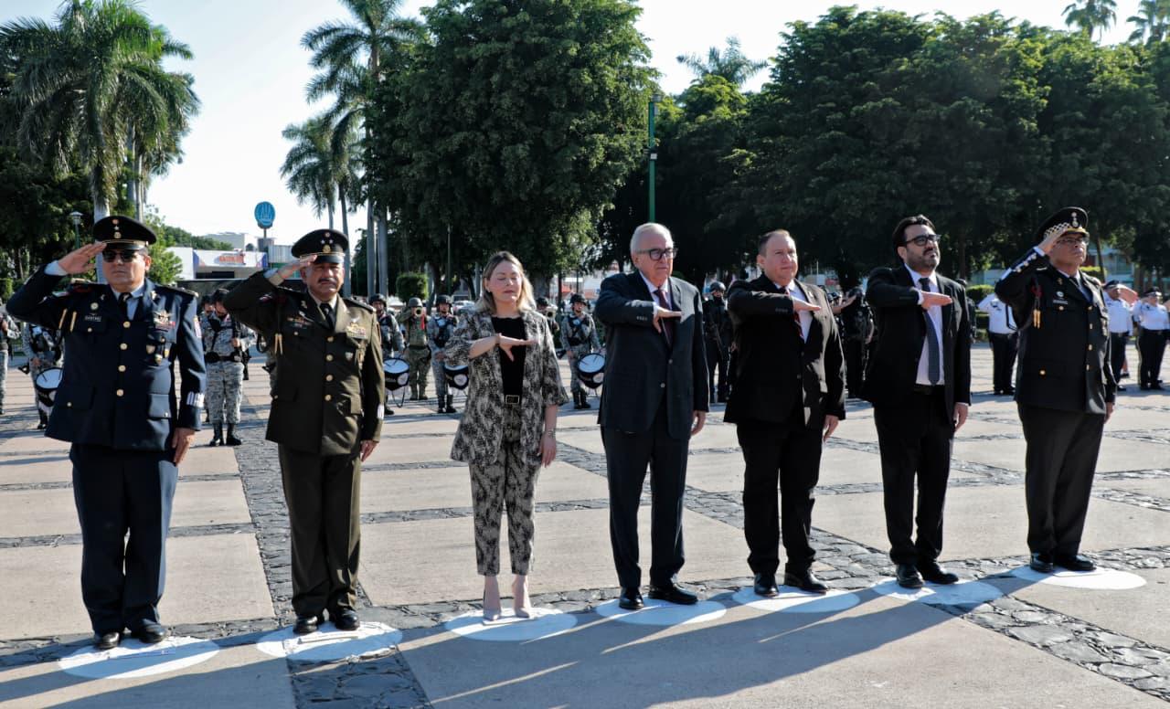 Culiacán, Sinaloa.- El gobernador Rubén Rocha Moya, acompañado de autoridades civiles y militares presidieron el acto conmemorativo al 142 aniversario del nacimiento del Gral. Ángel Flores y aniversario de los caídos en la lucha de la democracia de la plaza de las Tres Culturas, en Tlatelolco, con el izamiento de bandera a media hasta y honores de ordenanza en la plaza cívica de Palacio de Gobierno.