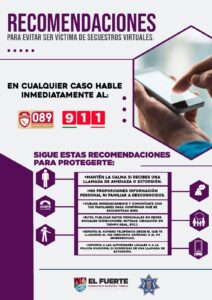El Fuerte, Sinaloa.- El H. Ayuntamiento de El Fuerte, a través de la Dirección de Seguridad Pública y Tránsito Municipal, hace un llamado a la ciudadanía a mantenerse alerta ante los recientes casos de secuestros virtuales detectados en el municipio, principalmente dirigidos a jóvenes menores de edad.
