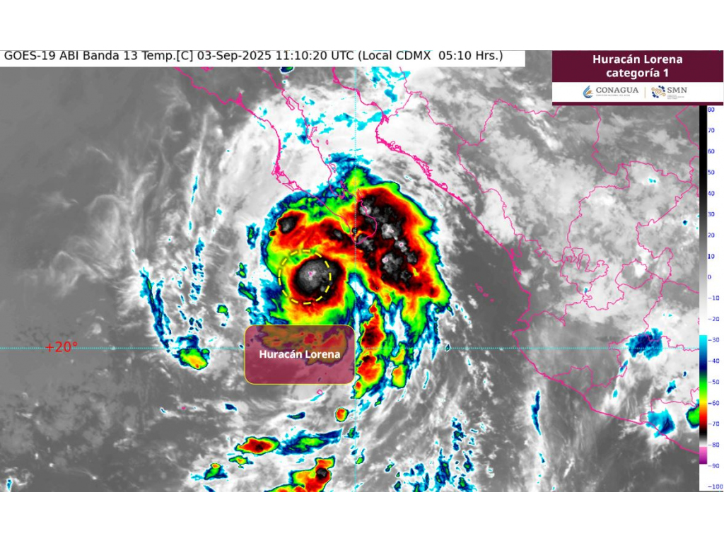Durante la madrugada de este miércoles, el huracán Lorena alcanzó la categoría 1 en la escala Saffir-Simpson, con vientos máximos sostenidos de 120 kilómetros por hora (km/h), rachas de hasta 150 km/h y un desplazamiento hacia el noroeste a una velocidad de 24 km/h.