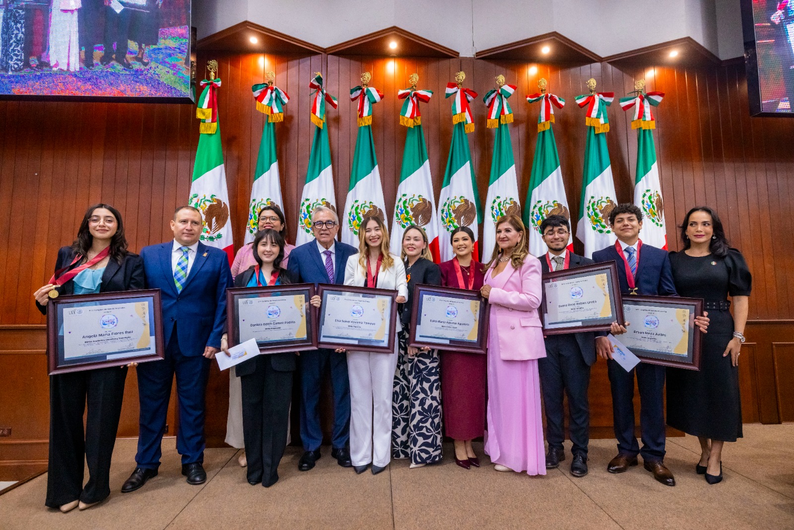 Por su parte, la presidenta de la Junta de Coordinación Política, la diputada Tere Guerra Ochoa, igualmente expresó su felicitación a los seis galardonados, y aseguró que las y los jóvenes son la fuerza transformadora porque con su tenacidad y empuje, con su talento, creatividad y sabiduría, hacen grande a Sinaloa.