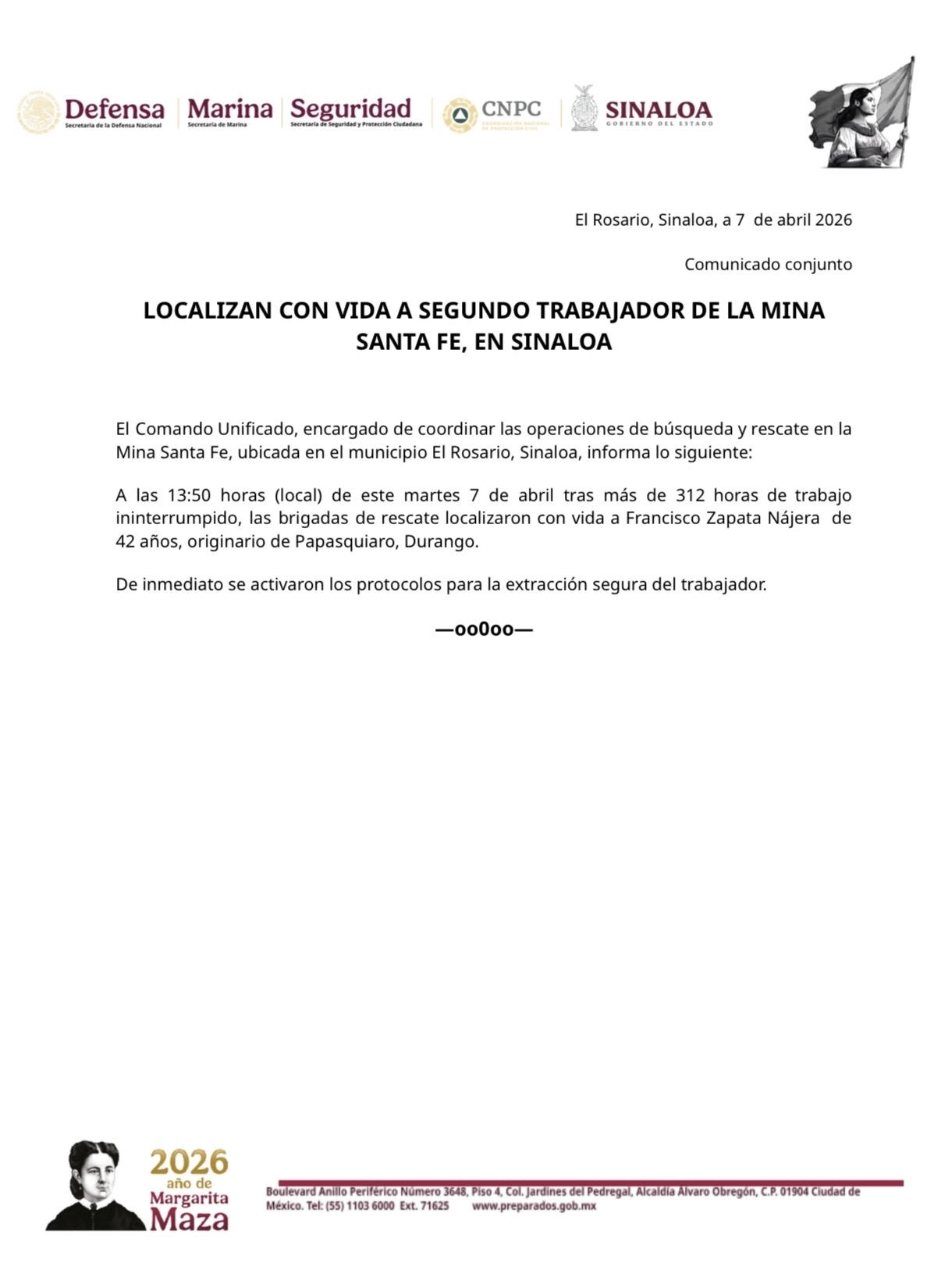 El Rosario, 7 de abril de 2026.- Autoridades informaron la localización con vida de un segundo trabajador que permanecía atrapado en la mina Santa Fe, luego de más de 312 horas de labores ininterrumpidas de búsqueda y rescate.