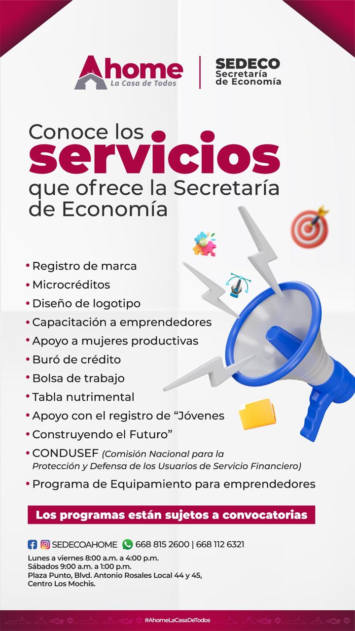 Los Mochis, Ahome, Sinaloa.- La Secretaría de Desarrollo Económico (SEDECO) del Municipio de Ahome, invita a los interesados en emprender o crecer algún negocio a que se acerquen a sus oficinas para aprovechar los diversos servicios, programas y ventanillas que tiene a disposición de manera permanente.